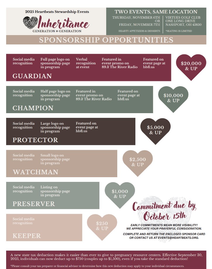 If you have any questions or would like assistance, please don’t hesitate to call Melissa at 740-349-7558 x204 or email events@heartbeats.org. We are deeply grateful for your commitment and support.